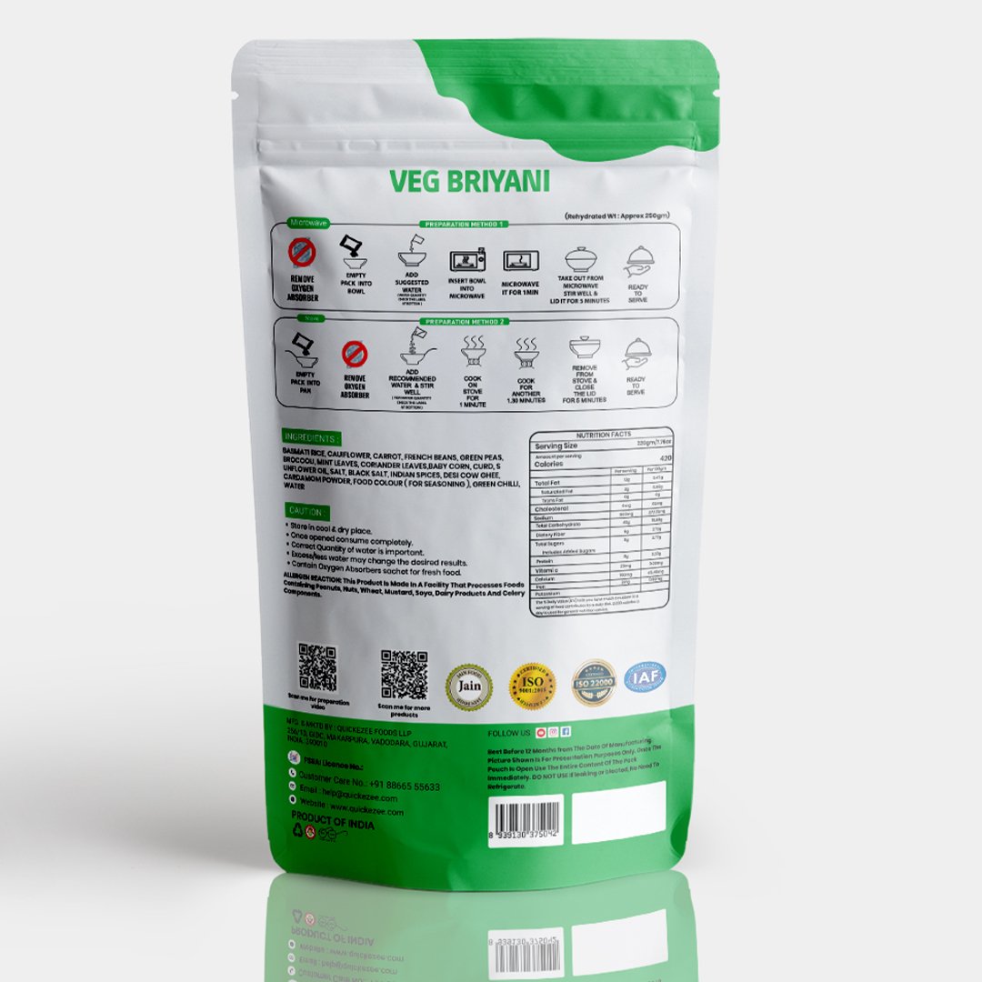 BASMATI RICE, CAUIFLOWER, CARROT, FRENCH BEANS, GREEN PEAS, BROCCOLI, MINT LEAVES, CORIANDER LEAVES,BABY CORN, CURD, SUNFLOWER OIL, SALT, BLACK SALT, INDIAN SPICES, DESI COW GHEE, CARDAMOM POWDER, FOOD COLOUR ( FOR SEASONING ), GREEN CHILLI, WATER
