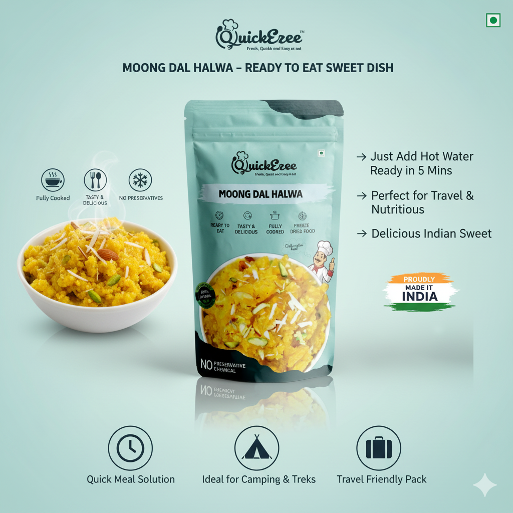 Treat yourself to the rich, decadent, and traditional taste of Moong Dal Halwa! QuickEzee brings you this classic Indian sweet, made from ground yellow moong lentils slow-roasted in ghee (clarified butter) and generously blended with sugar, milk solids (khoya), and aromatic cardamom, topped with crunchy nuts. It's the perfect warm indulgence!