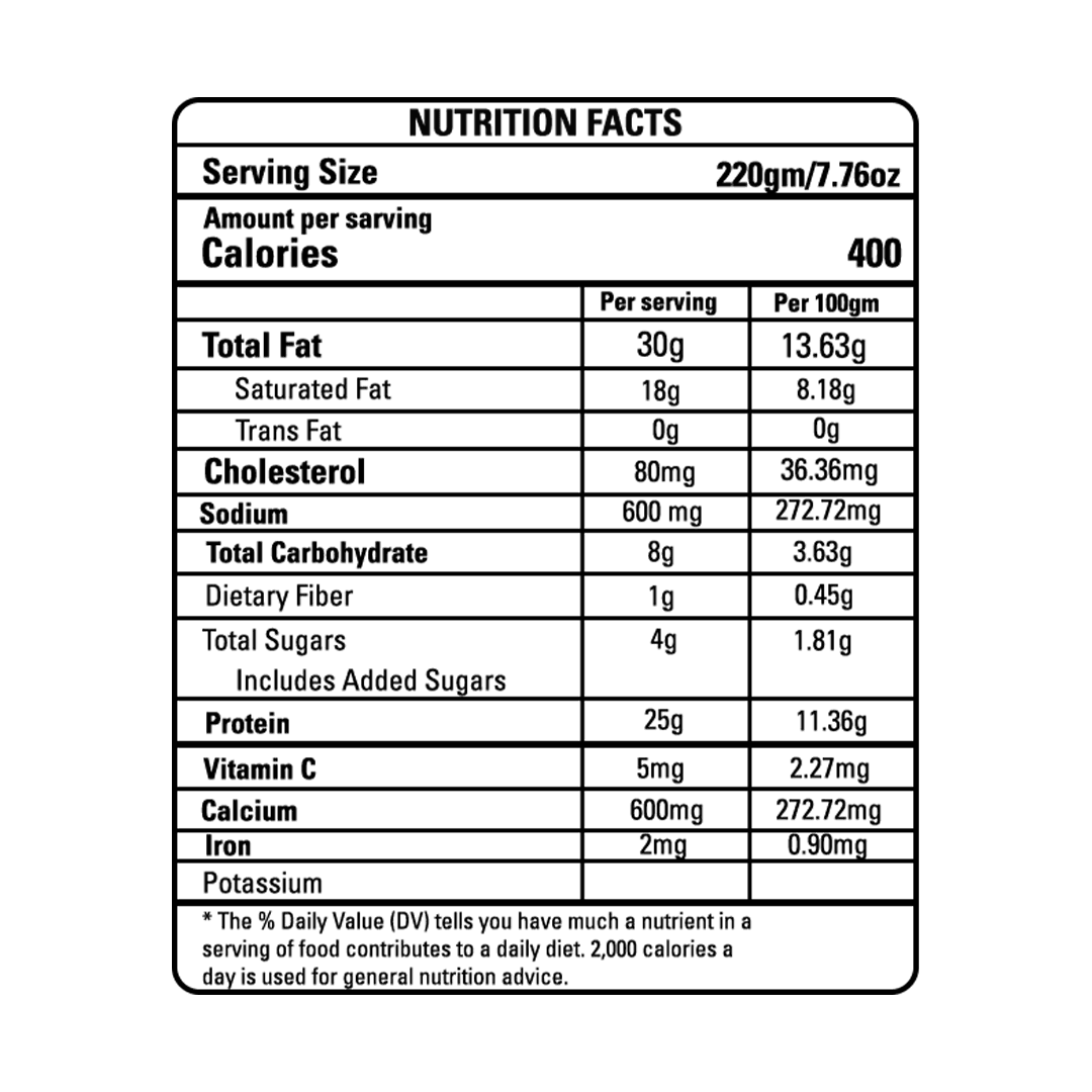 COTTAGE CHEESE ( 20 % ), GREEN, RED, YELLOW BELL PAPER, TOMATO, ONION, GINGER & GARLIC PASTE ( GINGER, GARLIC & WATER- 3 % ), GREEN CHILLI SLICED, SPICES ( CUMIN, CORIANDER, CLOVE, CARDAMOM, CINNAMON, DRY MANGO,TURMERIC, RED CHILLI , DRY FENUGREEK POWDER _ 3 % ), SUNFLOWER OIL, SALT, CORIANDER LEAVES.