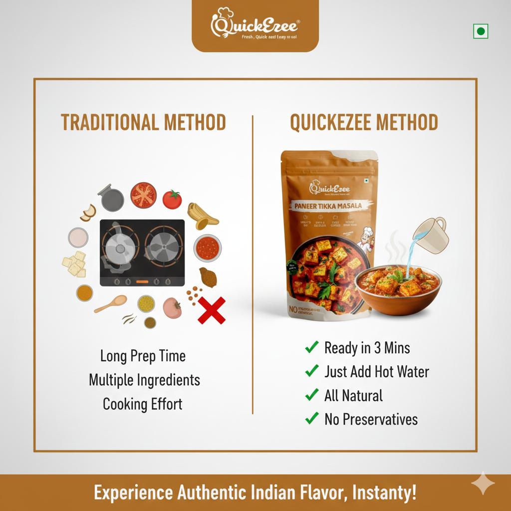 Indulge in the rich and creamy flavors of authentic Indian Paneer Tikka Masala in just 3 minutes! QuickEzee brings you a perfectly spiced, restaurant-quality meal that’s ready to eat.