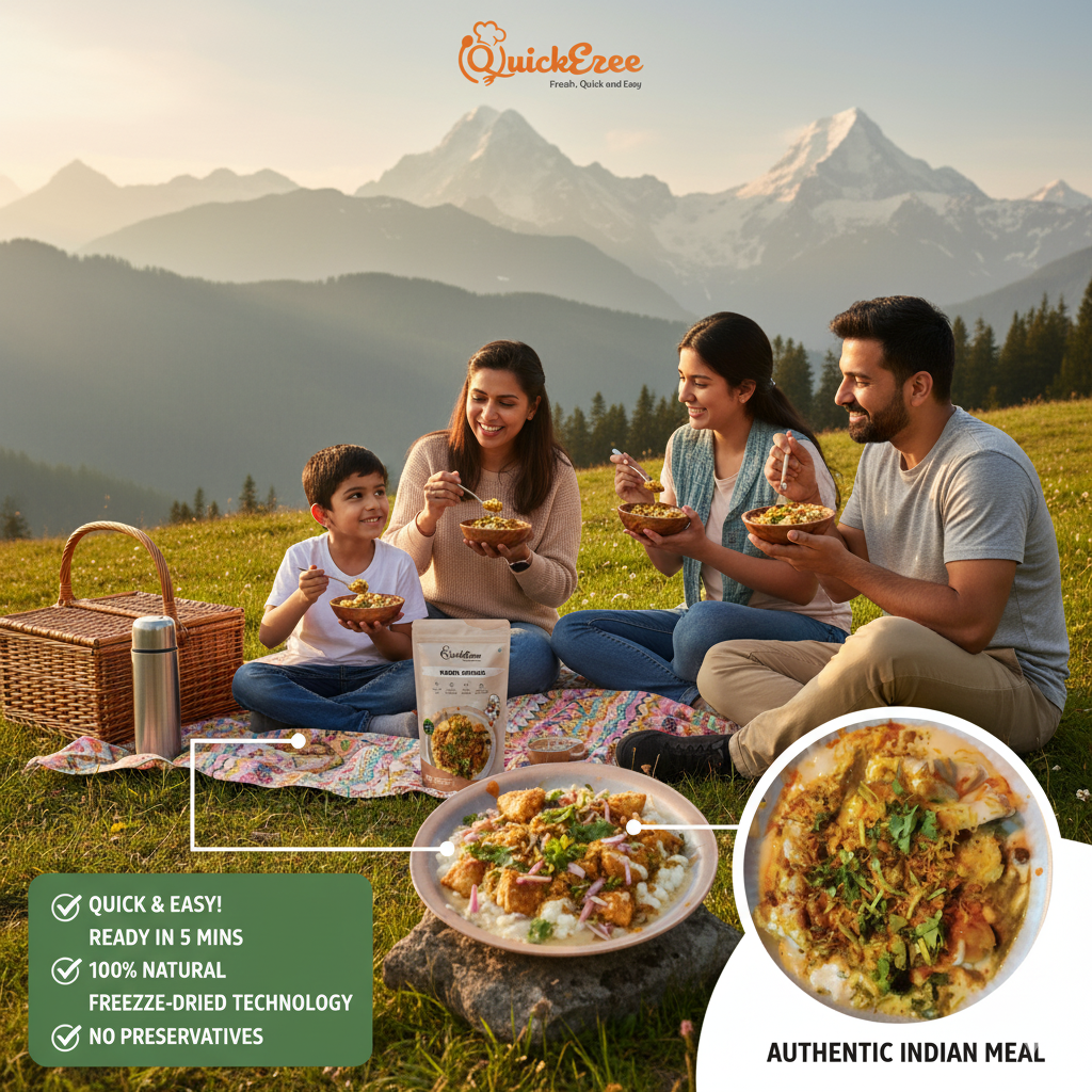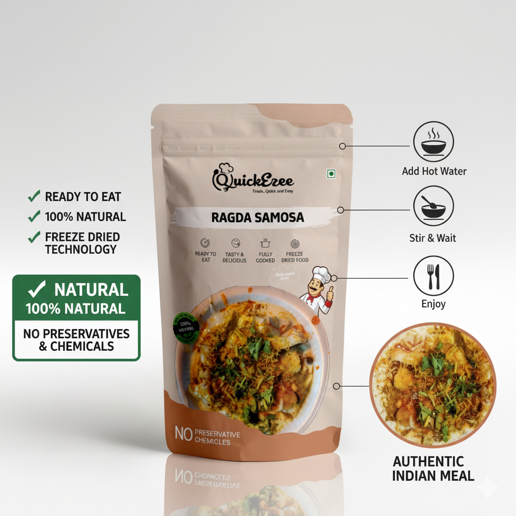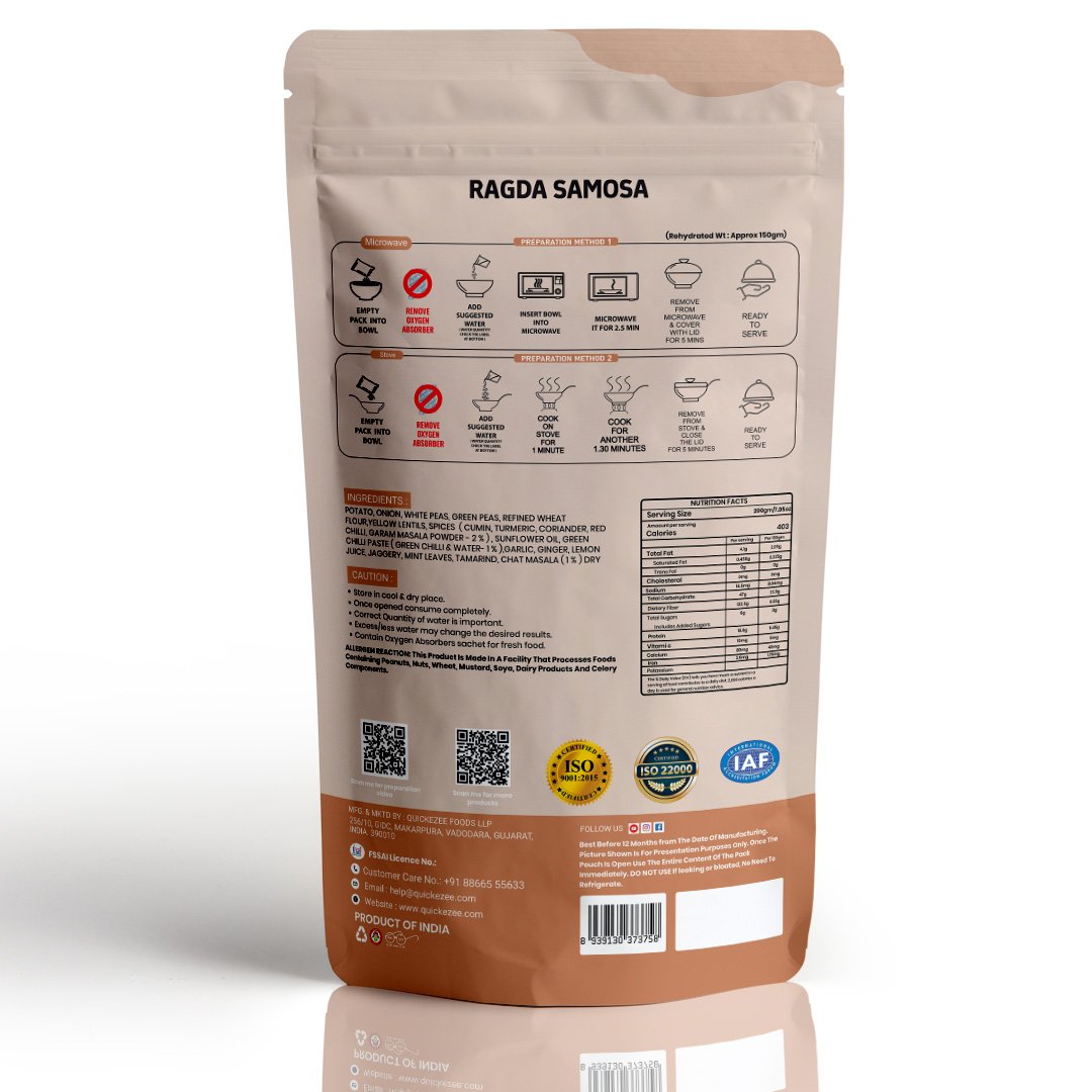 QuickEzee Ragda Samosa: Instant Chaat Craving Killer. Savory ragda and crispy samosa combo. Ready-to-eat street food satisfaction! A layered taste explosion, ready-to-eat in minutes! Flaky samosa submerged in tangy, spiced ragda. Authentic chaat flavor, zero prep. Your favorite street food fix, ready instantly! Crispy samosa topped with savory pea curry and chutneys. Just heat and enjoy this spicy delight!