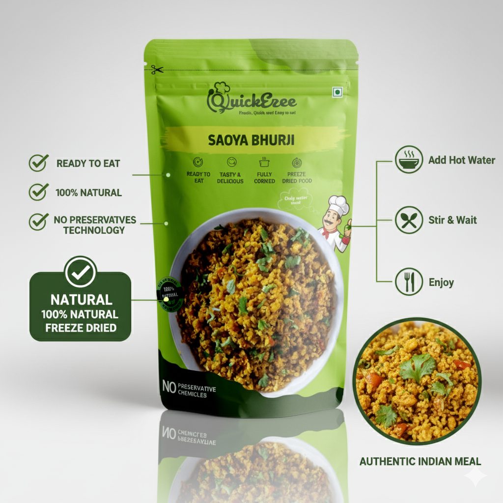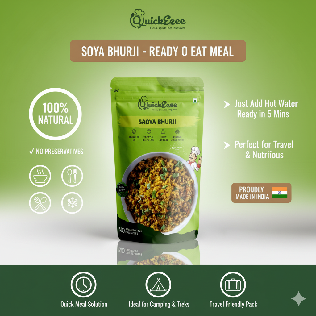 QuickEzee Soya Bhurji: Instant Veggie Delight. Savory, spiced soya bhurji, ready in minutes. High protein, maximum convenience. A tasty, ready-to-eat meatless scramble perfect for a quick breakfast or side dish. High in protein, low on effort! Your quick protein fix! Deliciously spiced, scrambled soya chunks with onion and tomato. Ready-to-eat and guilt-free.