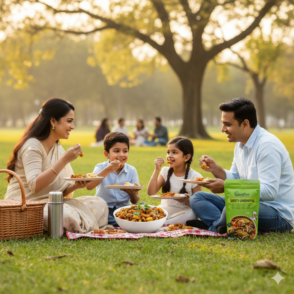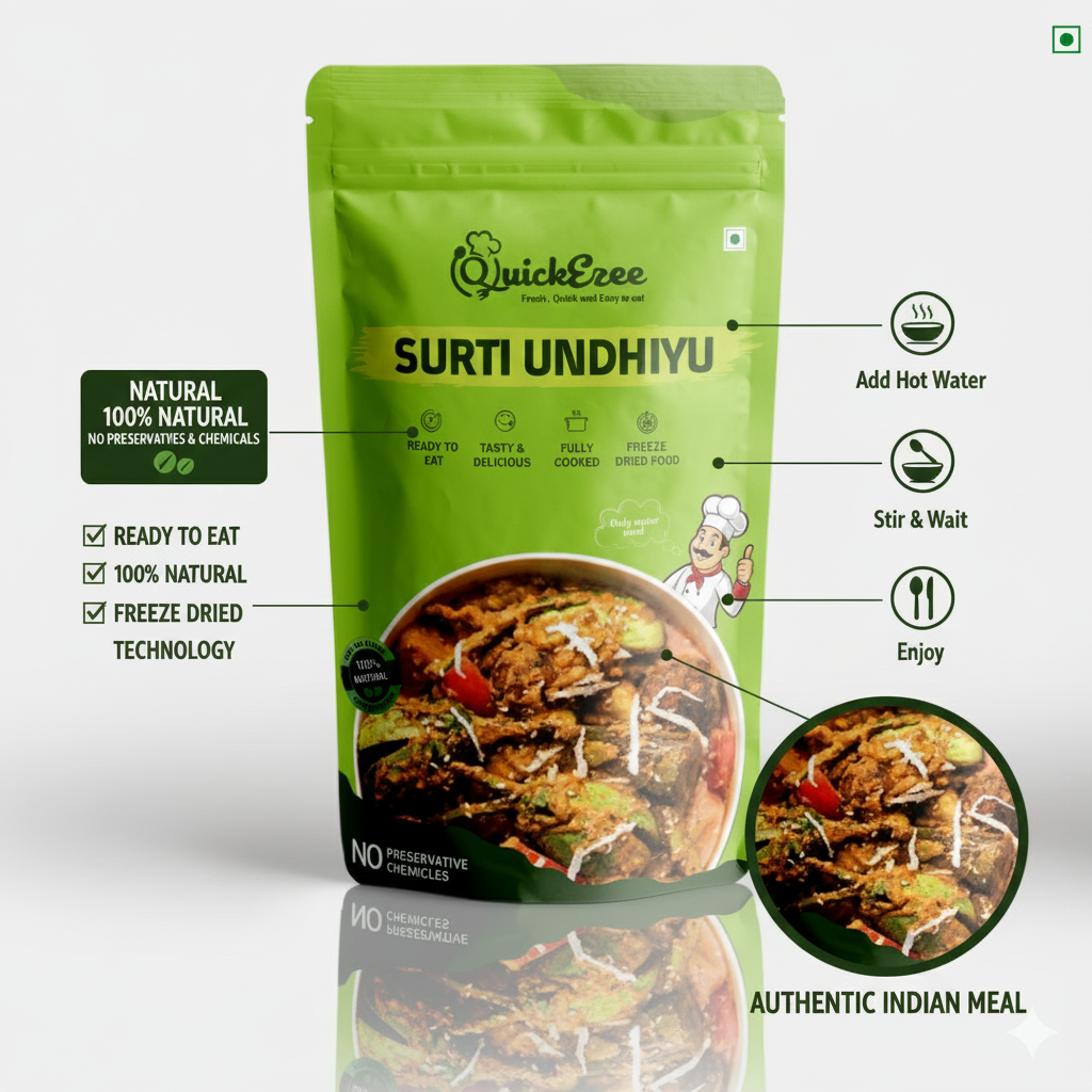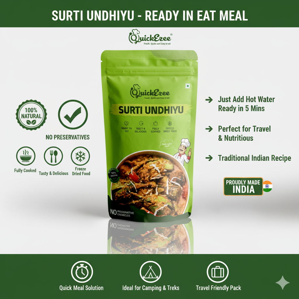 QuickEzee Surti Undhiyu: Instant Gujarati Classic. The complex, earthy taste of Undhiyu, ready-to-eat in minutes. Authentic, rich, and effortless. Packed with fresh winter veggies and traditional Surti spices. Enjoy this ready-to-eat regional delicacy without the effort. The rich, authentic flavors of Gujarat, ready instantly! A traditional medley of winter vegetables and spices. Just heat and savor.