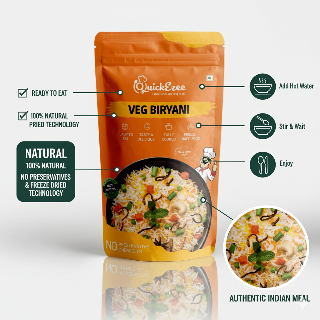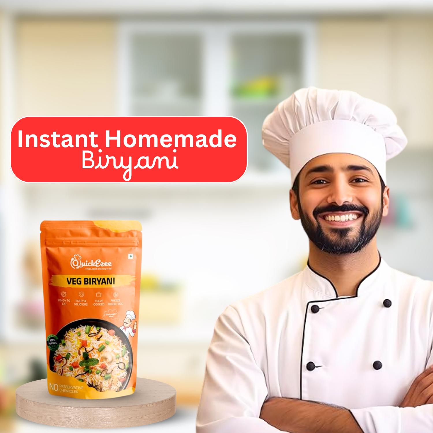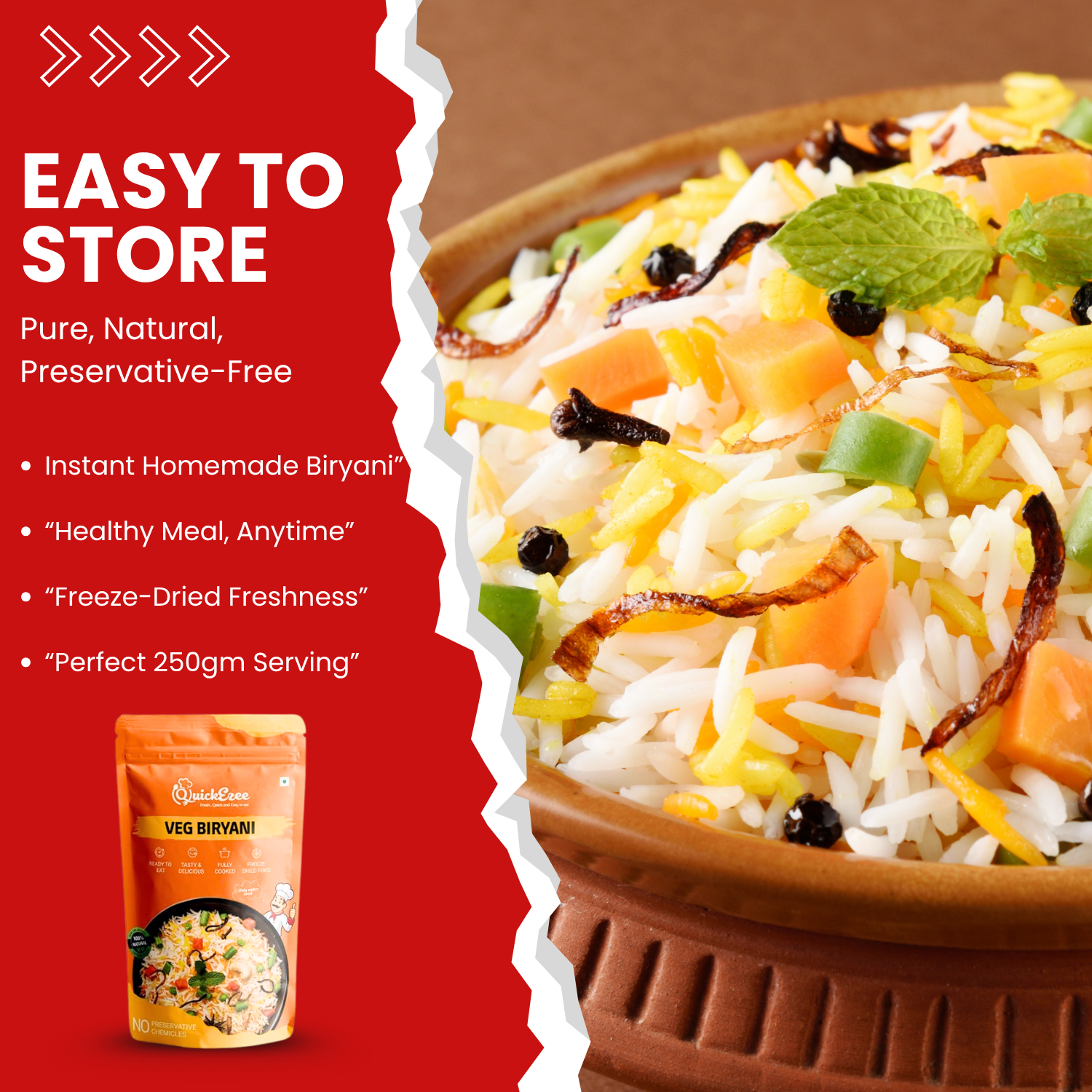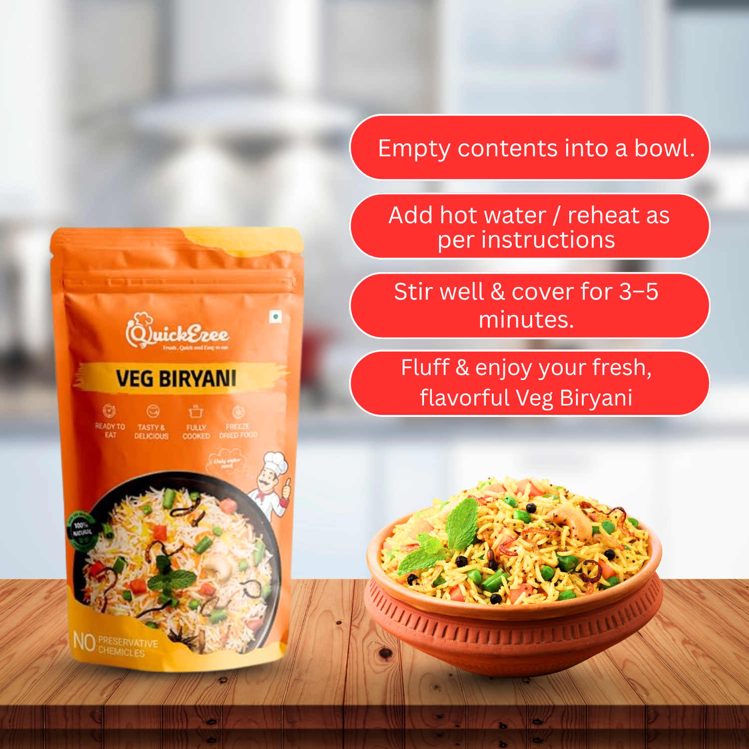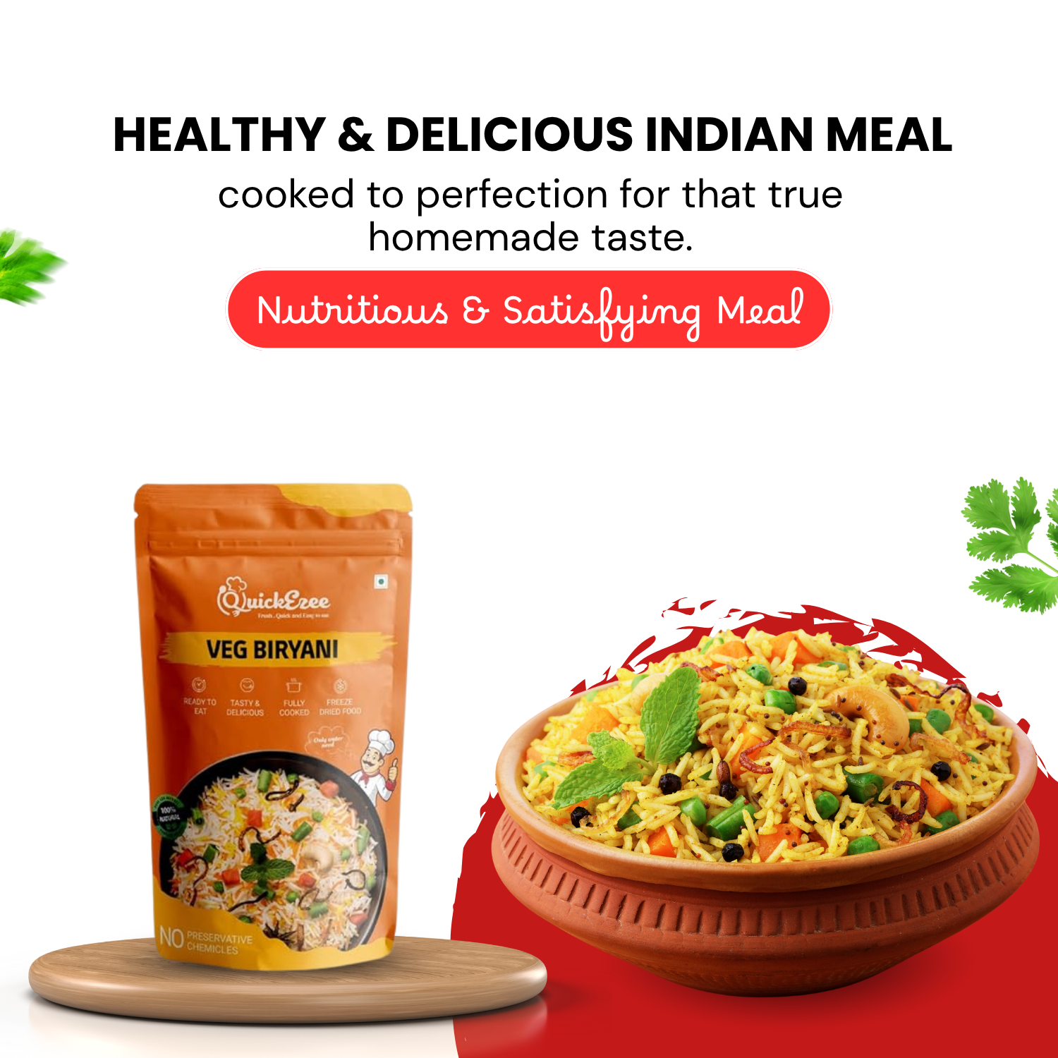 QuickEzee Veg Biryani: Instant comfort. Perfectly spiced, ready-to-eat vegetable biryani. A delicious meal, no cooking required! Authentic spices meet fluffy basmati. Just heat and enjoy a flavorful, ready-to-eat feast!